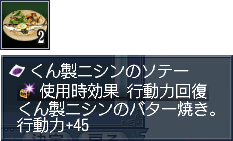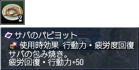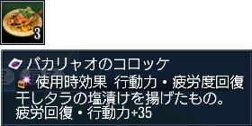 効果はこの通り。行動力の回復量はピザと同じですね。疲労回復がどれだけかは判りませんが。